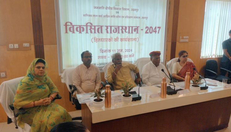 जयपुर, (11 जून 2024)। केंद्र सरकार के विकसित भारत मिशन अंतर्गत विकसित राजस्थान-2047 अभियान के तहत जनजाति उपयोजना क्षेत्र का विजन दस्तावेज तैयार करने को लेकर जनजाति क्षेत्रीय विकास विभाग तथा माणिक्यलाल वर्मा आदिम जाति शोध एवं प्रशिक्षण संस्थान के संयुक्त तत्वावधान में टीएडी क्षेत्र के जनप्रतिनिधियों और स्वयंसेवी संगठनों के प्रतिनिधियों की कार्यशाला मंगलवार को जनजाति क्षेत्रीय विकास मंत्री बाबूलाल खराड़ी की अध्यक्षता में उदयपुर आयुक्त कार्यालय सभागार में हुई। कार्यशाला में राज्यसभा सांसद चुन्नीलाल गरासिया, नवनिर्वाचित सांसद उदयपुर डॉ. मन्नालाल रावत तथा राजसमंद सांसद महिमा कुमारी भी मौजूद रहे। जनप्रतिनिधियों तथा अन्य हितधारकों ने जनजाति अंचल के समेकित विकास पर मंथन करते हुए महत्वपूर्ण सुझाव दिए गए। इन सुझावों को समावेशित करते हुए विजन दस्तावेज तैयार किया जाएगा।