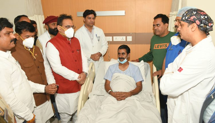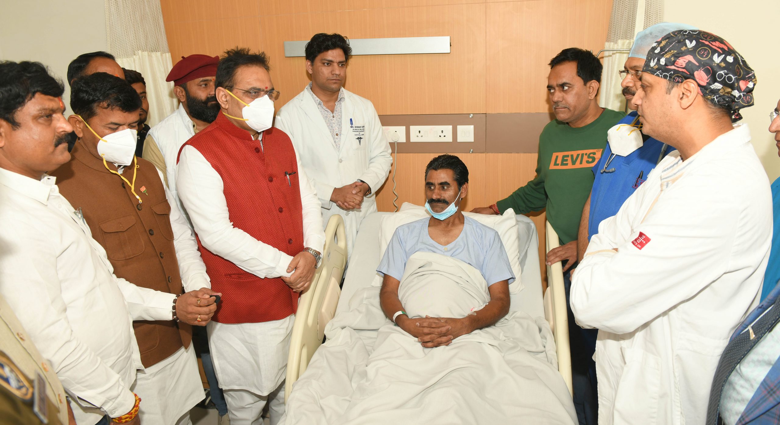 जयपुर, (5 मार्च 2024)। मुख्यमंत्री भजनलाल शर्मा ने मंगलवार को झोटवाड़ा के बैंक कैशियर नरेन्द्र सिंह शेखावत और उनके परिजनों के साथ मणिपाल अस्पताल में मुलाकात कर उनकी कुशलक्षेम जानी एवं चिकित्सकों से उनकी सेहत के संबंध में जानकारी ली। मुख्यमंत्री का इस अवसर पर लोगों ने अभिवादन भी किया।