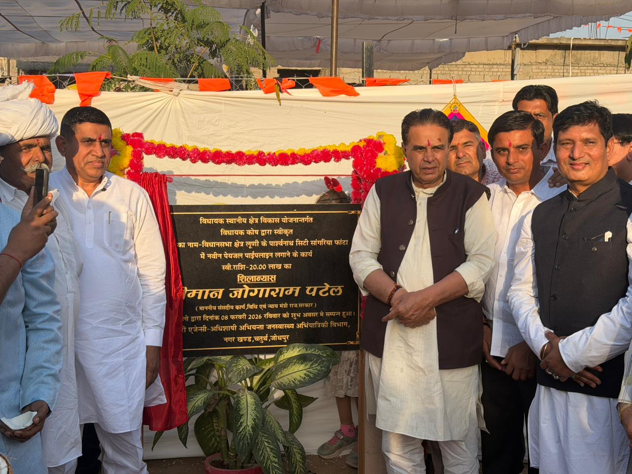 जयपुर, (08 फरवरी 2026)। संसदीय कार्य, विधि एवं विधिक कार्य मंत्री जोगाराम पटेल ने रविवार को जोधपुर की ग्राम पंचायत पाल में विधायक स्थानीय क्षेत्र योजनांतर्गत 20 लाख रूपये की लागत के आंतरिक पेयजल पाइपलाइन कार्य का विधिवत शिलान्यास किया।