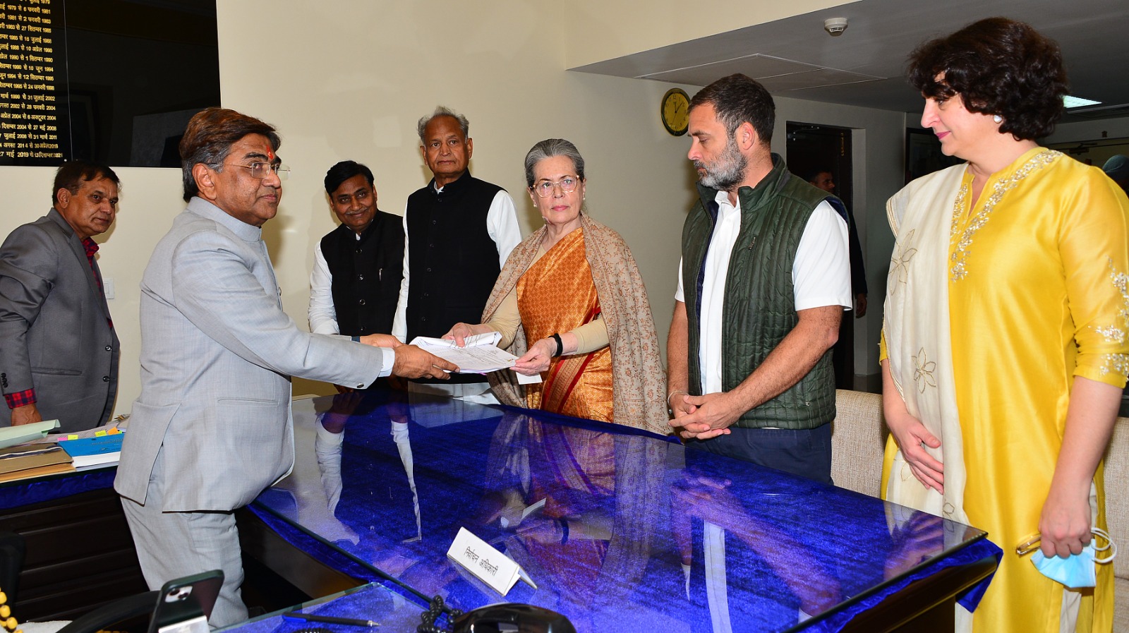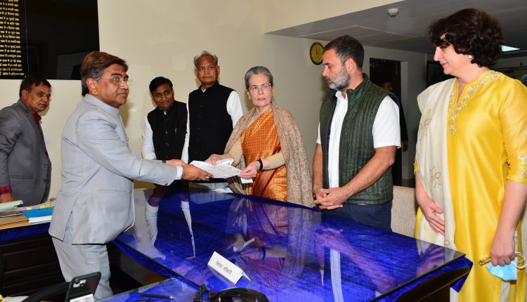 जयपुर, (14 फरवरी 2024)। राजस्थान से राज्य सभा की तीन सीटों के लिए होने वाले द्विवार्षिक निर्वाचन के लिए बुधवार को इंडियन नेशनल कांग्रेस की ओर से सोनिया गांधी ने रिटर्निंग ऑफिसर महावीर प्रसाद शर्मा को नामांकन पत्र प्रस्तुत किया। गांधी द्वारा नामांकन पत्र दाखिल करते समय उनके साथ पूर्व मुख्यमंत्री अशोक गहलोत, सांसद राहुल गांधी, विधायक गोविन्द सिंह डोटासरा एवं प्रियंका गांधी मौजूद थे। गांधी ने 4 नामांकन पत्र दाखिल किये। नामांकन पत्र प्रस्तुत करने के बाद रिटर्निंग ऑफिसर महावीर प्रसाद शर्मा ने उम्मीदवार गांधी को शपथ दिलायी।